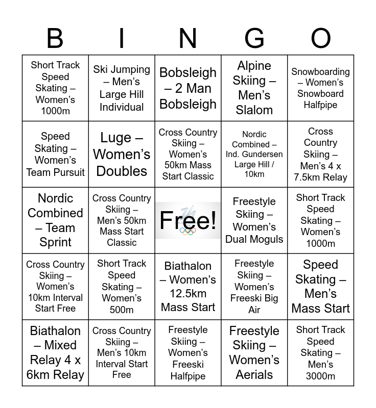 This bingo card has a free space and 119 words: Alpine Skiing – Women’s Downhill, Alpine Skiing – Women’s Slalom, Alpine Skiing – Women’s Giant Slalom, Alpine Skiing – Women’s Super-G, Alpine Skiing – Women’s Team Combined, Alpine Skiing – Men’s Downhill, Alpine Skiing – Men’s Slalom, Alpine Skiing – Men’s Giant Slalom, Alpine Skiing – Men’s Super-G, Alpine Skiing – Men’s Team Combined, Biathalon – Men’s 20km Individual, Biathalon – Women’s 15km Individual, Biathalon – Men’s 10km Sprint, Biathalon – Women’s 7.5km Sprint, Biathalon – Men’s 12.5km Pursuit, Biathalon – Women’s 10km Pursuit, Biathalon – Women’s 12.5km Mass Start, Biathalon – Men’s 15km Mass Start, Biathalon – Men’s 4 x 7.5km Relay, Biathalon – Women’s 4 x 6km Relay, Biathalon – Mixed Relay 4 x 6km Relay, Bobsleigh – 2 Man Bobsleigh, Bobsleigh – 4 Man Bobsleigh, Bobsleigh – 2 Woman Bobsleigh, Bobsleigh – Women’s Monobob, Cross Country Skiing – Women’s 10km Interval Start Free, Cross Country Skiing – Men’s 10km Interval Start Free, Cross Country Skiing – Women’s 10km + 10km Skiathlon, Cross Country Skiing – Men’s 10lm + 10km Skiathlon, Cross Country Skiing – Women’s 4 x 7.5km Relay, Cross Country Skiing – Men’s 4 x 7.5km Relay, Cross Country Skiing – Women’s 50km Mass Start Classic, Cross Country Skiing – Men’s 50km Mass Start Classic, Cross Country Skiing – Women’s Sprint Classic, Cross Country Skiing – Men’s Sprint Classic, Cross Country Skiing – Women’s Team Sprint Free, Cross Country Skiing – Men’s Team Sprint Free, Curling – Women, Curling – Men, Curling – Mixed Doubles, Figure Skating – Men Single Skating, Figure Skating – Women Single Skating, Figure Skating – Pair Skating, Figure Skating – Ice Dance, Figure Skating – Team Event, Freestyle Skiing – Women’s Moguls, Freestyle Skiing – Women’s Dual Moguls, Freestyle Skiing – Women’s Aerials, Freestyle Skiing – Women’s Ski Cross, Freestyle Skiing – Women’s Freeski Halfpipe, Freestyle Skiing – Women’s Freeski Slopestyle, Freestyle Skiing – Women’s Freeski Big Air, Freestyle Skiing – Men’s Moguls, Freestyle Skiing – Men’s Dual Moguls, Freestyle Skiing – Men’s Aerials, Freestyle Skiing – Men’s Ski Cross, Freestyle Skiing – Men’s Freeski Halfpipe, Freestyle Skiing – Men’s Freeski Slopestyle, Freestyle Skiing – Men’s Freeski Big Air, Freestyle Skiing – Mixed Team Aerials, Ice Hockey – Mens, Ice Hockey – Womens, Luge – Men’s Singles, Luge – Women’s Singles, Luge – Men’s Doubles, Luge – Women’s Doubles, Luge – Team Relay, Nordic Combined – Ind. Gundersen Normal Hill / 10km, Nordic Combined – Ind. Gundersen Large Hill / 10km, Nordic Combined – Team Sprint, Short Track Speed Skating – Women’s 500m, Short Track Speed Skating – Women’s 1000m, Short Track Speed Skating – Women’s 1500m, Short Track Speed Skating – Men’s 3000m, Short Track Speed Skating – Men’s 500m, Short Track Speed Skating – Men’s 1000m, Short Track Speed Skating – Men’s 1500m, Short Track Speed Skating – Men’s 3000m, Short Track Speed Skating – Women’s 500m, Short Track Speed Skating – Women’s 1000m, Short Track Speed Skating – Women’s 1500m, Short Track Speed Skating – Mixed Team Relay, Skeleton – Men, Skeleton – Women, Skeleton – Mixed Team, Ski Jumping – Women’s Normal Hill Individual, Ski Jumping – Women’s Large Hill Individual, Ski Jumping – Men’s Normal Hill Individual, Ski Jumping – Men’s Large Hill Individual, Ski Jumping – Men’s Super Team, Ski Jumping – Mixed Team, Ski Mountaineering – Women’s Sprint, Ski Mountaineering – Men’s Sprint, Ski Mountaineering – Mixed Relay, Snowboarding – Women’s Parallel Giant Slalom, Snowboarding – Women’s Snowboard Cross, Snowboarding – Women’s Snowboard Halfpipe, Snowboarding – Women’s Snowboard Slopestyle, Snowboarding – Women’s Snowboard Big Air, Snowboarding – Men’s Parallel Giant Slalom, Snowboarding – Men’s Snowboard Cross, Snowboarding – Men’s Snowboard Halfpipe, Snowboarding – Men’s Snowboard Slopestyle, Snowboarding – Men’s Snowboard Big Air, Snowboarding – Mix Team Snowboard Cross, Speed Skating – Women’s 500m, Speed Skating – Women’s 1000m, Speed Skating – Women’s 1500m, Speed Skating – Women’s 3000m, Speed Skating – Women’s 5000m, Speed Skating – Women’s Mass Start, Speed Skating – Women’s Team Pursuit, Speed Skating – Men’s 500m, Speed Skating – Men’s 1000m, Speed Skating – Men’s 1500m, Speed Skating – Men’s 3000m, Speed Skating – Men’s 5000m, Speed Skating – Men’s Mass Start and Speed Skating – Men’s Team Pursuit.