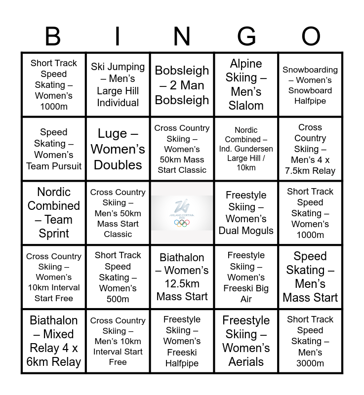 This bingo card has a free space and 119 words: Alpine Skiing – Women’s Downhill, Alpine Skiing – Women’s Slalom, Alpine Skiing – Women’s Giant Slalom, Alpine Skiing – Women’s Super-G, Alpine Skiing – Women’s Team Combined, Alpine Skiing – Men’s Downhill, Alpine Skiing – Men’s Slalom, Alpine Skiing – Men’s Giant Slalom, Alpine Skiing – Men’s Super-G, Alpine Skiing – Men’s Team Combined, Biathalon – Men’s 20km Individual, Biathalon – Women’s 15km Individual, Biathalon – Men’s 10km Sprint, Biathalon – Women’s 7.5km Sprint, Biathalon – Men’s 12.5km Pursuit, Biathalon – Women’s 10km Pursuit, Biathalon – Women’s 12.5km Mass Start, Biathalon – Men’s 15km Mass Start, Biathalon – Men’s 4 x 7.5km Relay, Biathalon – Women’s 4 x 6km Relay, Biathalon – Mixed Relay 4 x 6km Relay, Bobsleigh – 2 Man Bobsleigh, Bobsleigh – 4 Man Bobsleigh, Bobsleigh – 2 Woman Bobsleigh, Bobsleigh – Women’s Monobob, Cross Country Skiing – Women’s 10km Interval Start Free, Cross Country Skiing – Men’s 10km Interval Start Free, Cross Country Skiing – Women’s 10km + 10km Skiathlon, Cross Country Skiing – Men’s 10lm + 10km Skiathlon, Cross Country Skiing – Women’s 4 x 7.5km Relay, Cross Country Skiing – Men’s 4 x 7.5km Relay, Cross Country Skiing – Women’s 50km Mass Start Classic, Cross Country Skiing – Men’s 50km Mass Start Classic, Cross Country Skiing – Women’s Sprint Classic, Cross Country Skiing – Men’s Sprint Classic, Cross Country Skiing – Women’s Team Sprint Free, Cross Country Skiing – Men’s Team Sprint Free, Curling – Women, Curling – Men, Curling – Mixed Doubles, Figure Skating – Men Single Skating, Figure Skating – Women Single Skating, Figure Skating – Pair Skating, Figure Skating – Ice Dance, Figure Skating – Team Event, Freestyle Skiing – Women’s Moguls, Freestyle Skiing – Women’s Dual Moguls, Freestyle Skiing – Women’s Aerials, Freestyle Skiing – Women’s Ski Cross, Freestyle Skiing – Women’s Freeski Halfpipe, Freestyle Skiing – Women’s Freeski Slopestyle, Freestyle Skiing – Women’s Freeski Big Air, Freestyle Skiing – Men’s Moguls, Freestyle Skiing – Men’s Dual Moguls, Freestyle Skiing – Men’s Aerials, Freestyle Skiing – Men’s Ski Cross, Freestyle Skiing – Men’s Freeski Halfpipe, Freestyle Skiing – Men’s Freeski Slopestyle, Freestyle Skiing – Men’s Freeski Big Air, Freestyle Skiing – Mixed Team Aerials, Ice Hockey – Mens, Ice Hockey – Womens, Luge – Men’s Singles, Luge – Women’s Singles, Luge – Men’s Doubles, Luge – Women’s Doubles, Luge – Team Relay, Nordic Combined – Ind. Gundersen Normal Hill / 10km, Nordic Combined – Ind. Gundersen Large Hill / 10km, Nordic Combined – Team Sprint, Short Track Speed Skating – Women’s 500m, Short Track Speed Skating – Women’s 1000m, Short Track Speed Skating – Women’s 1500m, Short Track Speed Skating – Men’s 3000m, Short Track Speed Skating – Men’s 500m, Short Track Speed Skating – Men’s 1000m, Short Track Speed Skating – Men’s 1500m, Short Track Speed Skating – Men’s 3000m, Short Track Speed Skating – Women’s 500m, Short Track Speed Skating – Women’s 1000m, Short Track Speed Skating – Women’s 1500m, Short Track Speed Skating – Mixed Team Relay, Skeleton – Men, Skeleton – Women, Skeleton – Mixed Team, Ski Jumping – Women’s Normal Hill Individual, Ski Jumping – Women’s Large Hill Individual, Ski Jumping – Men’s Normal Hill Individual, Ski Jumping – Men’s Large Hill Individual, Ski Jumping – Men’s Super Team, Ski Jumping – Mixed Team, Ski Mountaineering – Women’s Sprint, Ski Mountaineering – Men’s Sprint, Ski Mountaineering – Mixed Relay, Snowboarding – Women’s Parallel Giant Slalom, Snowboarding – Women’s Snowboard Cross, Snowboarding – Women’s Snowboard Halfpipe, Snowboarding – Women’s Snowboard Slopestyle, Snowboarding – Women’s Snowboard Big Air, Snowboarding – Men’s Parallel Giant Slalom, Snowboarding – Men’s Snowboard Cross, Snowboarding – Men’s Snowboard Halfpipe, Snowboarding – Men’s Snowboard Slopestyle, Snowboarding – Men’s Snowboard Big Air, Snowboarding – Mix Team Snowboard Cross, Speed Skating – Women’s 500m, Speed Skating – Women’s 1000m, Speed Skating – Women’s 1500m, Speed Skating – Women’s 3000m, Speed Skating – Women’s 5000m, Speed Skating – Women’s Mass Start, Speed Skating – Women’s Team Pursuit, Speed Skating – Men’s 500m, Speed Skating – Men’s 1000m, Speed Skating – Men’s 1500m, Speed Skating – Men’s 3000m, Speed Skating – Men’s 5000m, Speed Skating – Men’s Mass Start and Speed Skating – Men’s Team Pursuit.