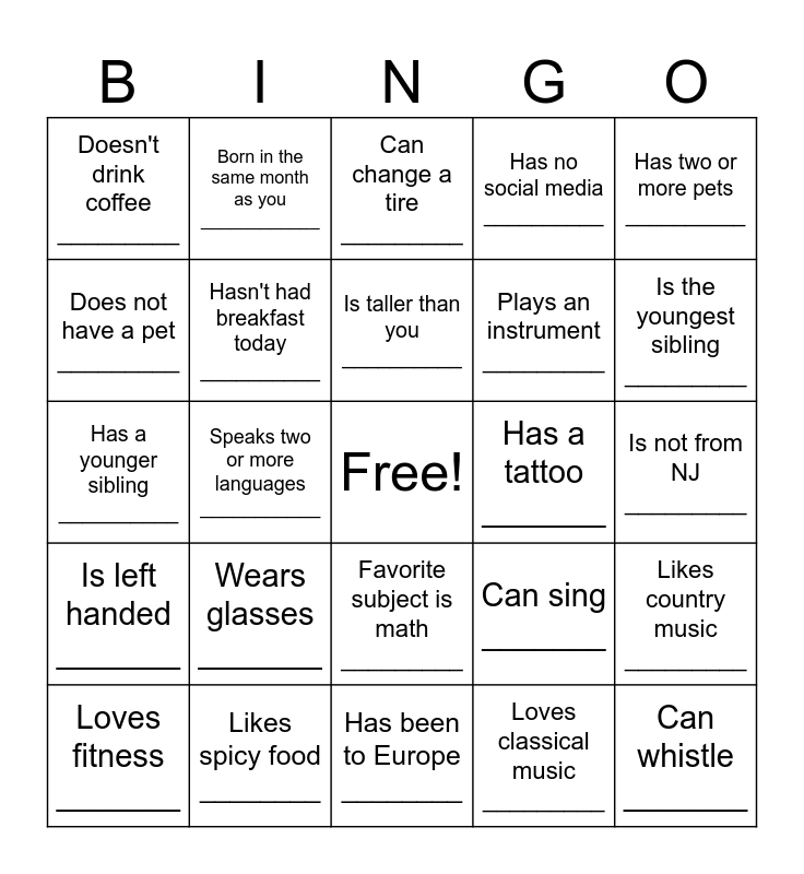 This bingo card has a free space and 24 words: Wears glasses _______, Likes spicy food ________, Is taller than you __________, Loves fitness _______, Has two or more pets __________, Doesn't drink coffee _________, Does not have a pet _________, Born in the same month as you ____________, Has a tattoo _______, Favorite subject is math _________, Plays an instrument _________, Has a younger sibling __________, Can sing _______, Likes country music _________, Hasn't had breakfast today __________, Loves classical music _________, Is not from NJ _________, Can change a tire _________, Is the youngest sibling _________, Speaks two or more languages ___________, Can whistle _______, Is left handed _______, Has no social media __________ and Has been to Europe ________.
