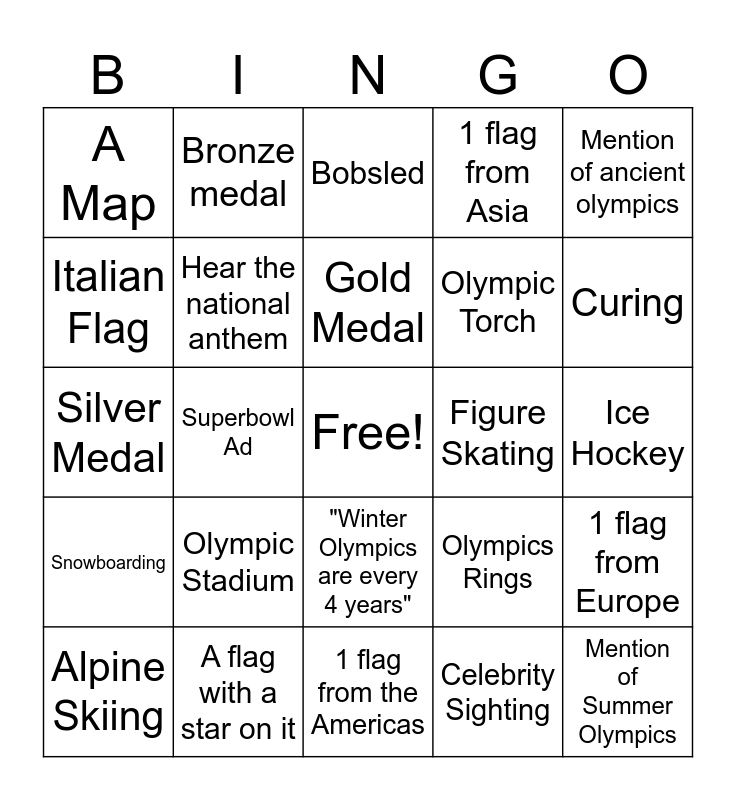 This bingo card has a free space and 27 words: Olympics Rings, Ice Hockey, Olympic Torch, 1 flag from the Americas, Italian Flag, Bobsled, Bronze medal, Snowboarding, Figure Skating, 1 flag from Europe, Silver Medal, 1 flag from Asia, Alpine Skiing, A flag with a star on it, Curing, Olympic Logo, Hear the national anthem, Gold Medal, Olympic Stadium, A Map, Ice Hockey, Celebrity Sighting, Superbowl Ad, Mention of Summer Olympics, "Winter Olympics are every 4 years", Mention of ancient olympics and Flowers.