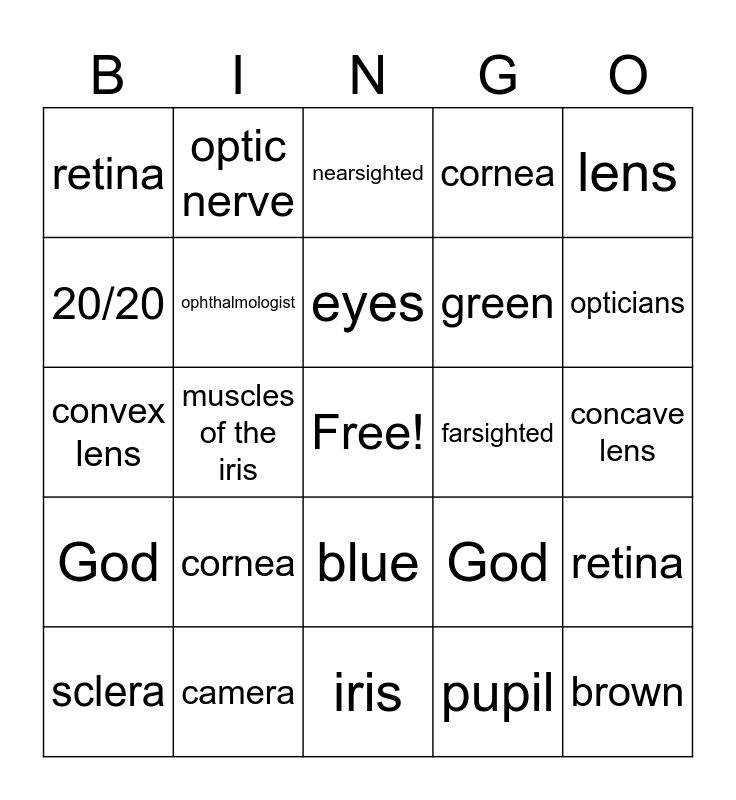 This bingo card has a free space and 24 words: sclera, cornea, eyes, pupil, lens, retina, optic nerve, nearsighted, farsighted, concave lens, convex lens, ophthalmologist, God, retina, 20/20, camera, iris, cornea, opticians, God, muscles of the iris, blue, green and brown.