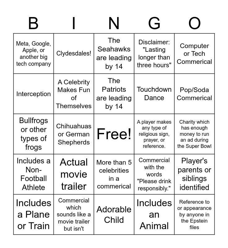 This bingo card has a free space and 34 words: Chip Commerical, Includes an Animal, Mocks a Politician, Involves Oceans or Water, Includes a Non-Football Athlete, A Celebrity Makes Fun of Themselves, Computer or Tech Commerical, Includes a Plane or Train, Clydesdales!, Alcohol, The Patriots are leading by 14, The Seahawks are leading by 14, Website Commerical, Any reference to Trump, A player makes any type of religious sign, prayer, or reference., Pop/Soda Commerical, Commercial which sounds like a movie trailer but isn't, Bullfrogs or other types of frogs, Actual movie trailer, Commercial with the words "Please drink responsibly.", More than 5 celebrities in a commerical, Song from when you were in high school or college, Meta, Google, Apple, or another big tech company, Charity which has enough money to run an ad during the Super Bowl, Adorable Child, Reference to or appearance by anyone in the Epstein files, Disclaimer: "Lasting longer than three hours", Challenge flag thrown, Touchdown Dance, Interception, Shirtless fans and/or fans with body paint, Chihuahuas or German Shepherds, Player's parents or siblings identified and Winter Olympics references.