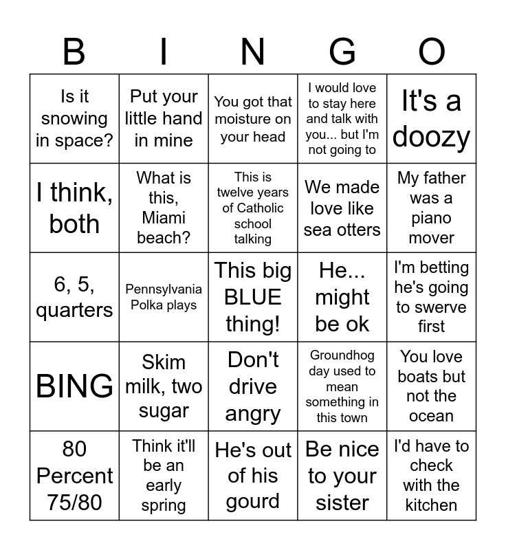 This bingo card has a free space and 29 words: 80 Percent 75/80, Prognosticator of Prognosticators, Seer of Seers, Pennsylvania Polka plays, Put your little hand in mine, Is it snowing in space?, You got that moisture on your head, What is this, Miami beach?, Skim milk, two sugar, He... might be ok, Think it'll be an early spring, I'm betting he's going to swerve first, I'd have to check with the kitchen, He's out of his gourd, Be nice to your sister, My father was a piano mover, I slept alone, Don't drive angry, BING, It's a doozy, 6, 5, quarters, Groundhog day used to mean something in this town, People are morons, We made love like sea otters, I think, both, I would love to stay here and talk with you... but I'm not going to, Put your little hand in mine, You love boats but not the ocean, This is twelve years of Catholic school talking and We've got to make it before the big storm.