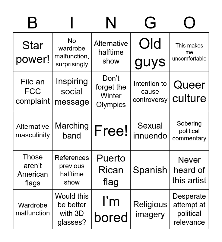 This bingo card has a free space and 33 words: This is just to sell dogs?, Jet packs, Marching band, Up With People, again?, Those aren’t American flags, Inspiring social message, This makes me uncomfortable, Wardrobe malfunction, No wardrobe malfunction, surprisingly, Outer space, Don’t forget the Winter Olympics, Alternative halftime show, Sensory overload, Frosty, pump it up, Sexual innuendo, Queer culture, Would this be better with 3D glasses?, Alternative masculinity, References previous halftime show, Spanish, Puerto Rican flag, Weird combination of artists, Star power!, Sobering political commentary, I’m bored, Desperate attempt at political relevance, Old guys, Intention to cause controversy, File an FCC complaint, Never heard of this artist, That’s a totally different sport, Religious imagery and Kids are watching this?.