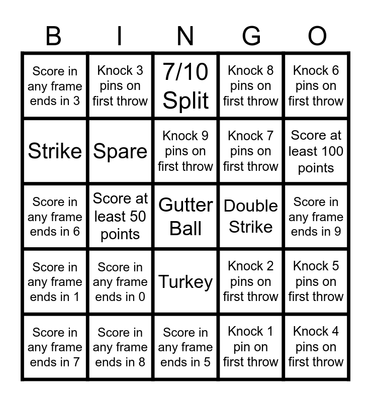 This bingo card has a free space and 24 words: Score in any frame ends in 0, Score in any frame ends in 8, Knock 9 pins on first throw, Score in any frame ends in 7, Knock 6 pins on first throw, Score in any frame ends in 3, Strike, Knock 3 pins on first throw, Double Strike, Turkey, Knock 7 pins on first throw, Score in any frame ends in 6, Knock 2 pins on first throw, Knock 5 pins on first throw, Spare, Knock 1 pin on first throw, Score in any frame ends in 9, 7/10 Split, Score at least 100 points, Score at least 50 points, Knock 4 pins on first throw, Score in any frame ends in 1, Knock 8 pins on first throw and Score in any frame ends in 5.