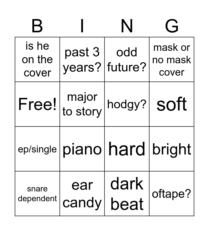 This bingo card has 17 words: snare dependent, ear candy, odd future?, mask or no mask cover, ep/single, major to story, hard, soft, Free!, piano, dark beat, bright, is he on the cover, past 3 years?, hodgy?, oftape? and Odd future dependent.