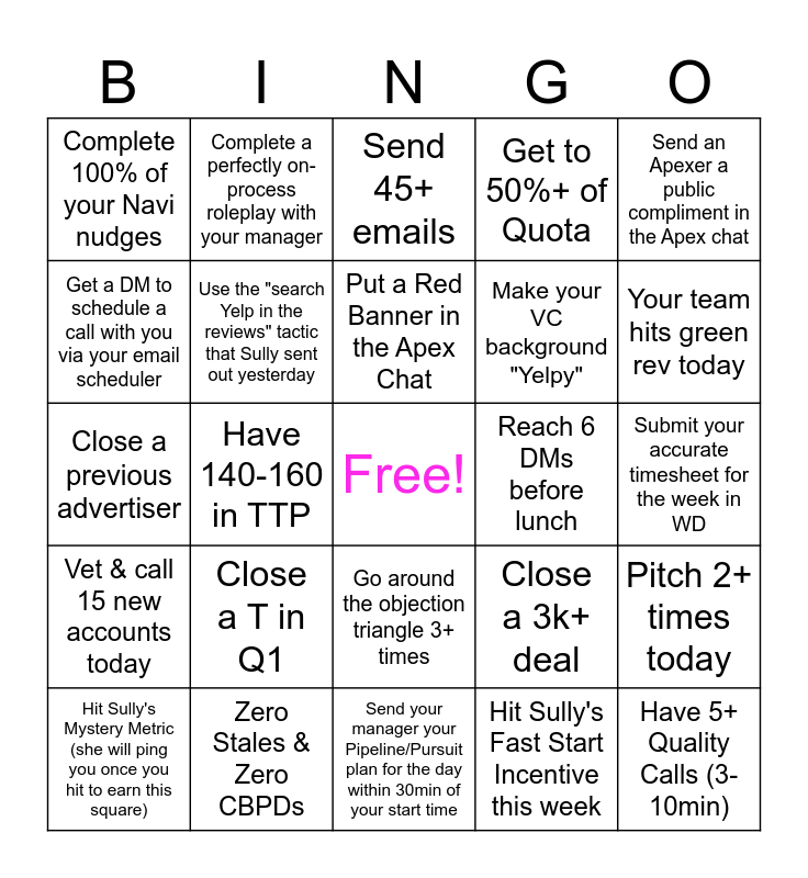 This bingo card has a free space and 24 words: Close a T in Q1, Zero Stales & Zero CBPDs, Put a Red Banner in the Apex Chat, Hit Sully's Mystery Metric (she will ping you once you hit to earn this square), Send an Apexer a public compliment in the Apex chat, Complete 100% of your Navi nudges, Get a DM to schedule a call with you via your email scheduler, Complete a perfectly on-process roleplay with your manager, Reach 6 DMs before lunch, Go around the objection triangle 3+ times, Make your VC background "Yelpy", Close a previous advertiser, Close a 3k+ deal, Pitch 2+ times today, Use the "search Yelp in the reviews" tactic that Sully sent out yesterday, Hit Sully's Fast Start Incentive this week, Submit your accurate timesheet for the week in WD, Send 45+ emails, Your team hits green rev today, Have 140-160 in TTP, Have 5+ Quality Calls (3-10min), Vet & call 15 new accounts today, Get to 50%+ of Quota and Send your manager your Pipeline/Pursuit plan for the day within 30min of your start time.