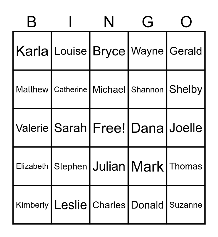 This bingo card has a free space and 25 words: Stephen, Charles, Michael, Kimberly, Gerald, Karla, Matthew, Louise, Dana, Julian, Shannon, Valerie, Mark, Thomas, Catherine, Marianne, Joelle, Bryce, Shelby, Sarah, Suzanne, Leslie, Elizabeth, Wayne and Donald.