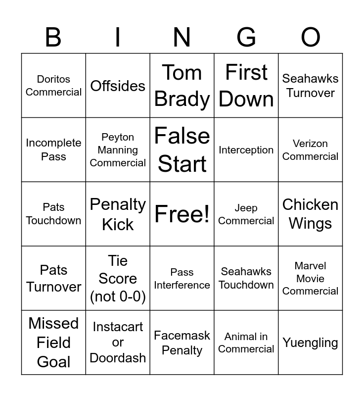 This bingo card has a free space and 29 words: Missed Field Goal, Draft Kings, Penalty Kick, Bud Light, Doritos Commercial, Tom Brady, Peyton Manning Commercial, Tie Score (not 0-0), Jeep Commercial, Instacart or Doordash, Chicken Wings, Yuengling, Facemask Penalty, Animal in Commercial, Verizon Commercial, FUMBLE, Pass Interference, Pats Turnover, Seahawks Turnover, Pats Touchdown, Seahawks Touchdown, Sabrina Carpenter Appearence, Interception, Incomplete Pass, First Down, Offsides, Marvel Movie Commercial, False Start and State Farm (feat Patrick Mahomes).