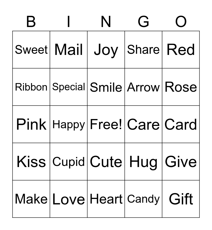 This bingo card has a free space and 30 words: Love, Friend, Happy, Kind, Sweet, Joy, Special, Cute, Care, Heart, Card, Gift, Candy, Chocolate, Rose, Flower, Hug, Kiss, Cupid, Red, Pink, Note, Mail, Arrow, Ribbon, Share, Give, Make, Smile and Hug.