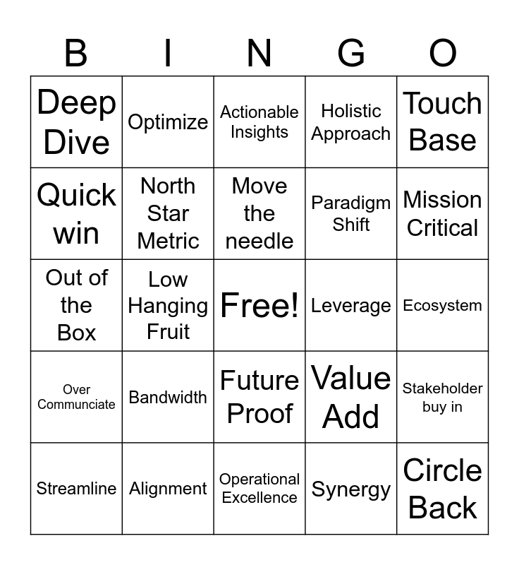 This bingo card has a free space and 24 words: Bandwidth, Alignment, Move the needle, Streamline, Touch Base, Deep Dive, Quick win, Optimize, Leverage, Future Proof, Paradigm Shift, Out of the Box, Value Add, Stakeholder buy in, North Star Metric, Synergy, Ecosystem, Actionable Insights, Mission Critical, Low Hanging Fruit, Circle Back, Over Communciate, Holistic Approach and Operational Excellence.
