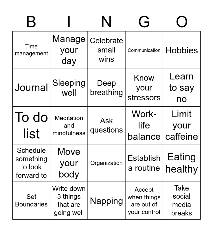 This bingo card has 25 words: Move your body, Napping, Deep breathing, Set Boundaries, Hobbies, Time management, Journal, Manage your day, Work-life balance, Organization, Know your stressors, To do list, Establish a routine, Eating healthy, Sleeping well, Take social media breaks, Limit your caffeine, Celebrate small wins, Learn to say no, Meditation and mindfulness, Ask questions, Write down 3 things that are going well, Schedule something to look forward to, Communication and Accept when things are out of your control.