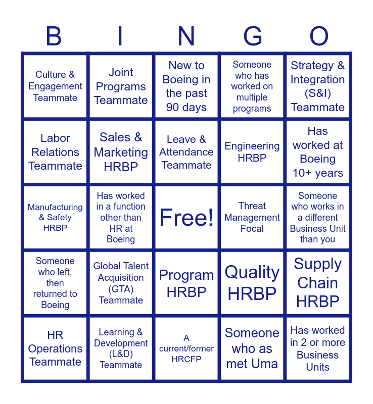 This bingo card has a free space and 24 words: Global Talent Acquisition (GTA) Teammate, Learning & Development (L&D) Teammate, Leave & Attendance Teammate, HR Operations Teammate, Strategy & Integration (S&I) Teammate, Culture & Engagement Teammate, Labor Relations Teammate, Joint Programs Teammate, Threat Management Focal, Program HRBP, Engineering HRBP, Manufacturing & Safety HRBP, Quality HRBP, Supply Chain HRBP, Sales & Marketing HRBP, Someone who as met Uma, Someone who works in a different Business Unit than you, New to Boeing in the past 90 days, Has worked at Boeing 10+ years, Has worked in a function other than HR at Boeing, Has worked in 2 or more Business Units, Someone who left, then returned to Boeing, Someone who has worked on multiple programs and A current/former HRCFP.