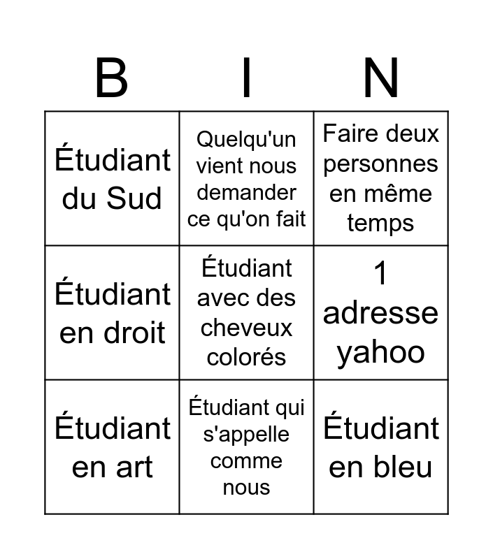 This bingo card has 9 words: Étudiant en art, Faire deux personnes en même temps, Quelqu'un vient nous demander ce qu'on fait, Étudiant en droit, Étudiant du Sud, 1 adresse yahoo, Étudiant avec des cheveux colorés, Étudiant en bleu and Étudiant qui s'appelle comme nous.