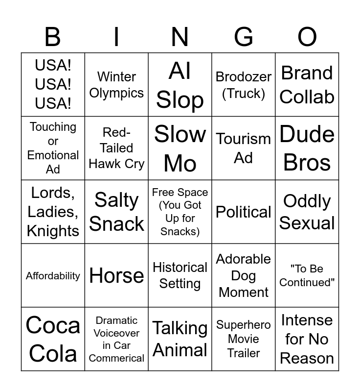 This bingo card has a free space and 29 words: Coca Cola, Bear, Salty Snack, Wrasslin', USA! USA! USA!, AI Slop, Red-Tailed Hawk Cry, Horse, Political, Dramatic Voiceover in Car Commerical, Oddly Sexual, Intense for No Reason, Talking Animal, Superhero Movie Trailer, Dude Bros, Founding Mothers & Fathers, Historical Setting, Affordability, Brand Collab, Lords, Ladies, Knights, Adorable Dog Moment, Surprise Jesus, Tourism Ad, Touching or Emotional Ad, Brodozer (Truck), Winter Olympics, "To Be Continued", Slow Mo and Clearly Trying to Go Viral.