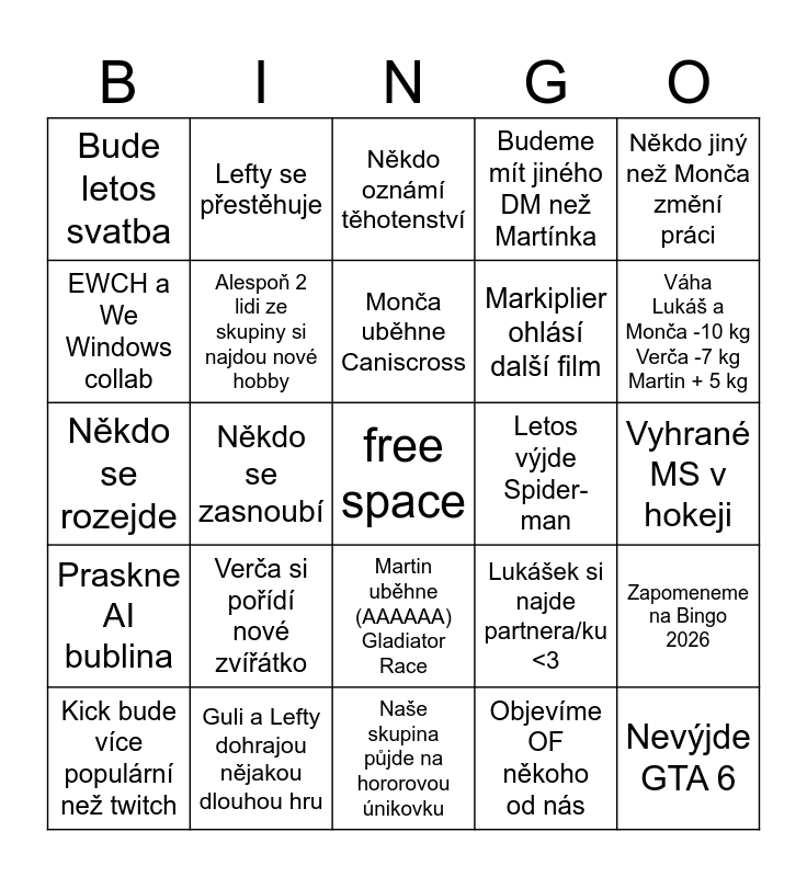 This bingo card has a free space and 24 words: Verča si pořídí nové zvířátko, Guli a Lefty dohrajou nějakou dlouhou hru, Monča uběhne Caniscross, Kick bude více populární než twitch, Někdo jiný než Monča změní práci, Bude letos svatba, EWCH a We Windows collab, Lefty se přestěhuje, Letos výjde Spider-man, Martin uběhne (AAAAAA) Gladiator Race, Markiplier ohlásí další film, Někdo se rozejde, Lukášek si najde partnera/ku <3, Zapomeneme na Bingo 2026, Alespoň 2 lidi ze skupiny si najdou nové hobby, Objevíme OF někoho od nás, Vyhrané MS v hokeji, Někdo oznámí těhotenství, Váha Lukáš a Monča -10 kg Verča -7 kg Martin + 5 kg, Někdo se zasnoubí, Nevýjde GTA 6, Praskne AI bublina, Budeme mít jiného DM než Martínka and Naše skupina půjde na hororovou únikovku.