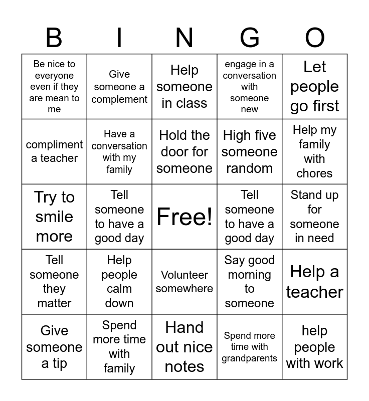 This bingo card has a free space and 24 words: Help people calm down, Spend more time with family, Hold the door for someone, Give someone a tip, Let people go first, Be nice to everyone even if they are mean to me, compliment a teacher, Give someone a complement, Tell someone to have a good day, Volunteer somewhere, High five someone random, Try to smile more, Say good morning to someone, Help a teacher, Have a conversation with my family, Spend more time with grandparents, Stand up for someone in need, Help someone in class, Help my family with chores, Tell someone to have a good day, help people with work, Tell someone they matter, engage in a conversation with someone new and Hand out nice notes.