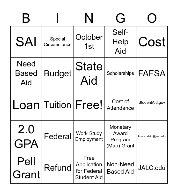 This bingo card has a free space and 24 words: Pell Grant, Federal, State Aid, Non-Need Based Aid, Cost, SAI, Special Circumstance, October 1st, Cost of Attendance, StudentAid.gov, Loan, Budget, Monetary Award Program (Map) Grant, financialaid@jalc.edu, Need Based Aid, Refund, Free Application for Federal Student Aid, Self- Help Aid, FAFSA, 2.0 GPA, Tuition, Work-Study Employment, Scholarships and JALC.edu.