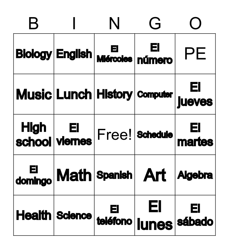 This bingo card has a free space and 24 words: Math, Science, History, Health, PE, Biology, Music, English, Schedule, Spanish, Computer, High school, Art, Algebra, Lunch, El lunes, El martes, El Miércoles, El jueves, El viernes, El sábado, El domingo, El número and El teléfono.