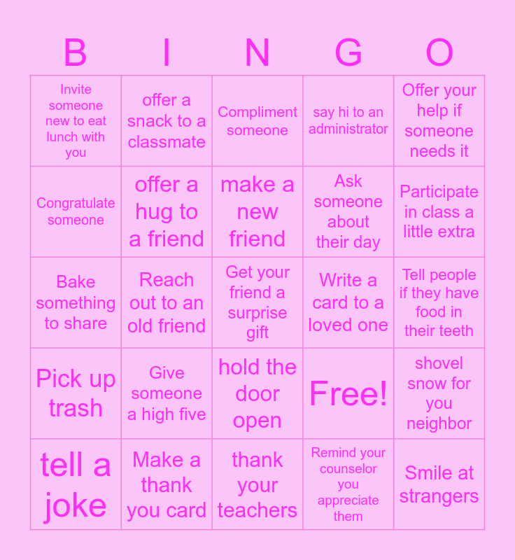 This bingo card has 25 words: Give someone a high five, thank your teachers, make a new friend, tell a joke, Offer your help if someone needs it, Invite someone new to eat lunch with you, Congratulate someone, offer a snack to a classmate, Write a card to a loved one, hold the door open, Ask someone about their day, Bake something to share, Free!, shovel snow for you neighbor, offer a hug to a friend, Smile at strangers, Tell people if they have food in their teeth, Compliment someone, Participate in class a little extra, Reach out to an old friend, Get your friend a surprise gift, Make a thank you card, Pick up trash, say hi to an administrator and Remind your counselor you appreciate them.