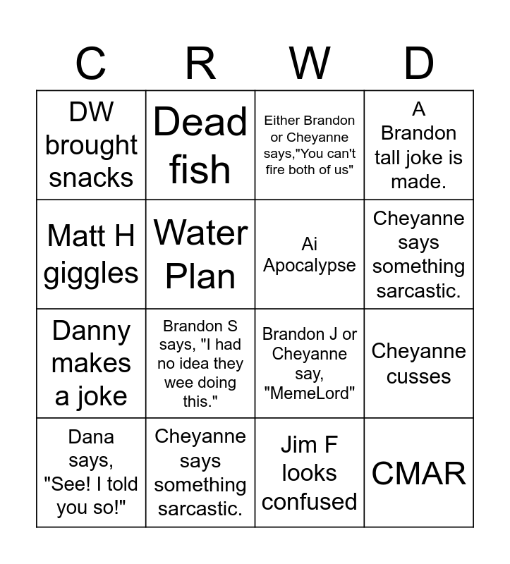 This bingo card has 19 words: Brandon J or Cheyanne say, "MemeLord", DW rubs head, Either Brandon or Cheyanne says,"You can't fire both of us", CMAR, Cheyanne cusses, Matt H giggles, Jim F looks confused, DW brought snacks, Dead fish, Danny makes a joke, Brandon S says, "I had no idea they wee doing this.", Water Plan, Ai Apocalypse, Cheyanne says something sarcastic., Dana says, "See! I told you so!", Tina says,"You guys!", A Brandon tall joke is made., Cheyanne says something sarcastic. and Dead fish.