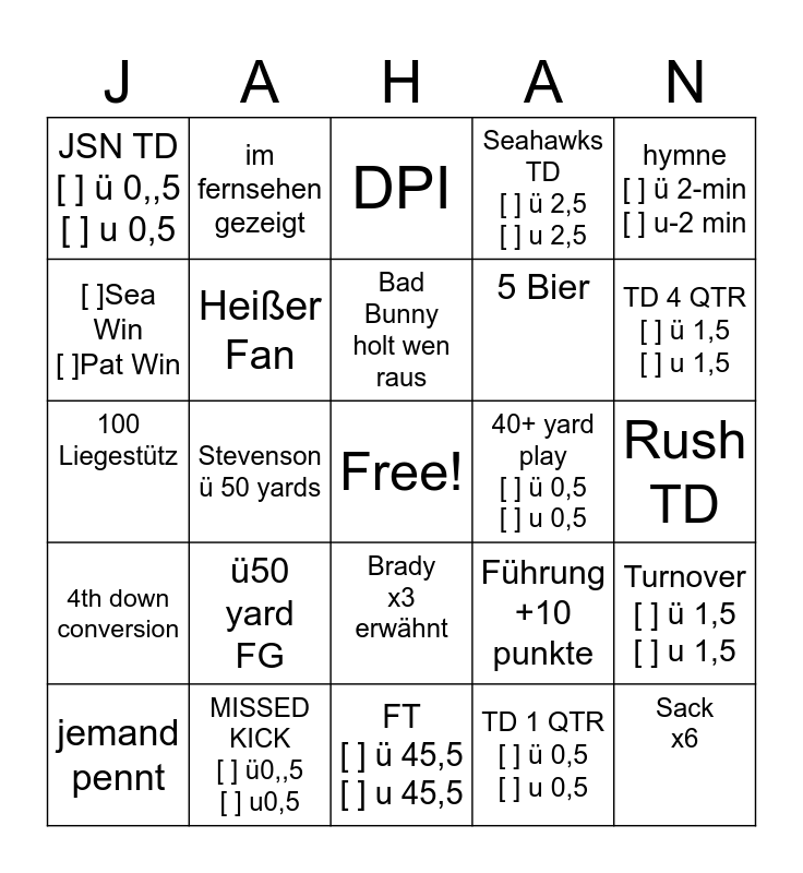 This bingo card has a free space and 24 words: ü50 yard FG, MISSED KICK [ ] ü0,,5 [ ] u0,5, Bad Bunny holt wen raus, jemand pennt, hymne [ ] ü 2-min [ ] u-2 min, JSN TD [ ] ü 0,,5 [ ] u 0,5, [ ]Sea Win [ ]Pat Win, im fernsehen gezeigt, 40+ yard play [ ] ü 0,5 [ ] u 0,5, Brady x3 erwähnt, 5 Bier, 100 Liegestütz, Führung +10 punkte, Turnover [ ] ü 1,5 [ ] u 1,5, Heißer Fan, TD 1 QTR [ ] ü 0,5 [ ] u 0,5, Rush TD, DPI, TD 4 QTR [ ] ü 1,5 [ ] u 1,5, Stevenson ü 50 yards, Sack x6, 4th down conversion, Seahawks TD [ ] ü 2,5 [ ] u 2,5 and FT [ ] ü 45,5 [ ] u 45,5.