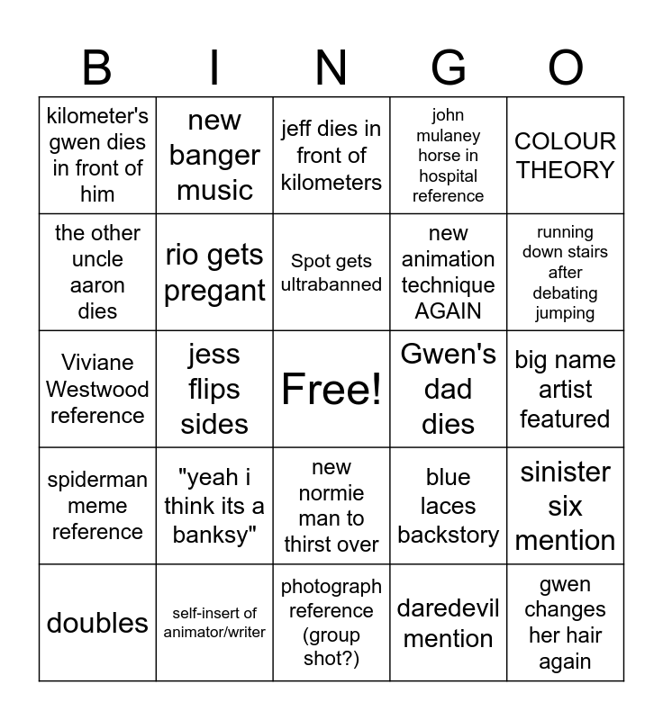 This bingo card has a free space and 24 words: "yeah i think its a banksy", self-insert of animator/writer, Spot gets ultrabanned, doubles, COLOUR THEORY, kilometer's gwen dies in front of him, the other uncle aaron dies, new banger music, Gwen's dad dies, new normie man to thirst over, new animation technique AGAIN, Viviane Westwood reference, blue laces backstory, sinister six mention, rio gets pregant, daredevil mention, big name artist featured, jeff dies in front of kilometers, running down stairs after debating jumping, jess flips sides, gwen changes her hair again, spiderman meme reference, john mulaney horse in hospital reference and photograph reference (group shot?).