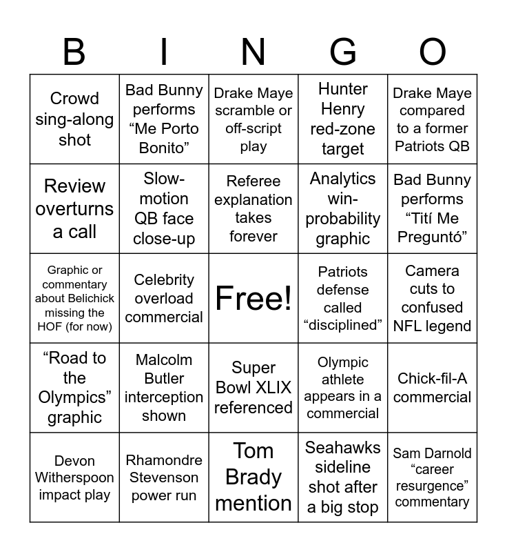 This bingo card has a free space and 44 words: Jaxon Smith-Njigba big catch or highlight, Sam Darnold “career resurgence” commentary, Sam Darnold under pressure graphic, Devon Witherspoon impact play, Seahawks defense praised as “fast” or “physical”, Seahawks sideline shot after a big stop, Drake Maye scramble or off-script play, Broadcast shows Drake Maye’s girlfriend, Drake Maye compared to a former Patriots QB, Rhamondre Stevenson power run, Hunter Henry red-zone target, Patriots defense called “disciplined”, Super Bowl XLIX referenced, Malcolm Butler interception shown, “They should’ve run the ball” moment, Tom Brady mention, Bill Belichick mentioned in relation to Patriots, Graphic or commentary about Belichick missing the HOF (for now), “Belichick tree” coaching mention, Bad Bunny performs “Tití Me Preguntó”, Bad Bunny performs “Me Porto Bonito”, Surprise guest joins Bad Bunny, Outfit change mid-performance, Crowd sing-along shot, Spanish lyrics subtitled on screen, Camera cuts to confused NFL legend, Puerto Rican flag shown (crowd, performer, graphic, or attire), Olympics promo airs, Olympic athlete appears in a commercial, “Road to the Olympics” graphic, Kevin Hart gambling commercial, Chick-fil-A commercial, Emotional insurance commercial, AI commercial that explains nothing, Celebrity overload commercial, Beer ad with nostalgia music, Fast-food commercial steals the show, Movie trailer with zero context, Referee explanation takes forever, Review overturns a call, Analytics win-probability graphic, Coach yelling on sideline, Slow-motion QB face close-up and Missed extra point.