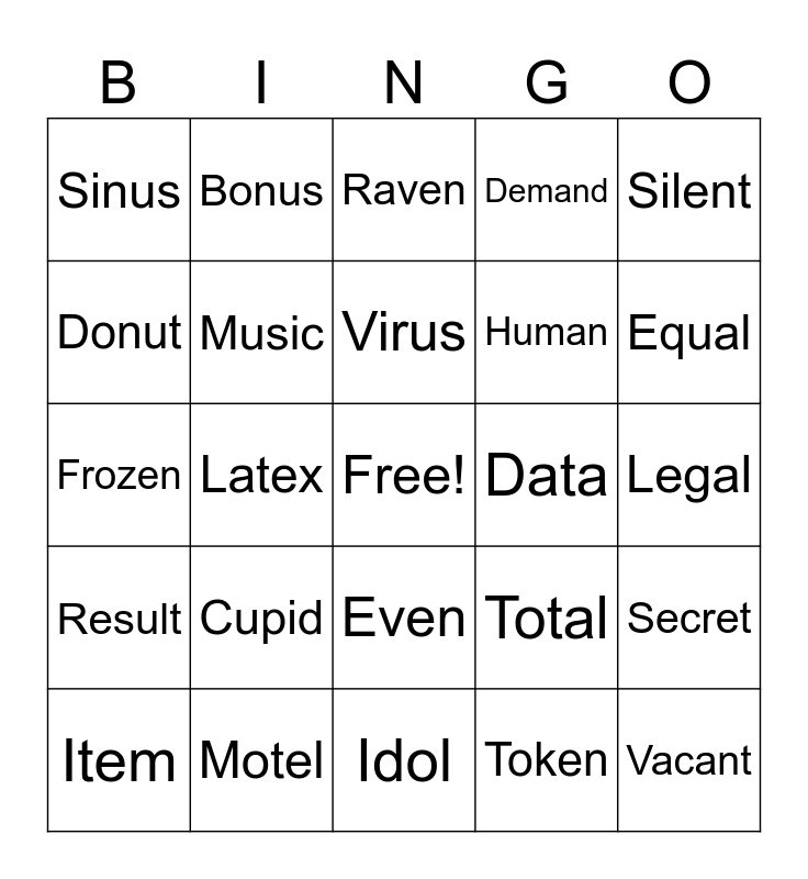This bingo card has a free space and 24 words: Cupid, Motel, Virus, Item, Silent, Sinus, Donut, Bonus, Data, Even, Human, Frozen, Total, Secret, Music, Token, Legal, Raven, Equal, Latex, Vacant, Result, Demand and Idol.
