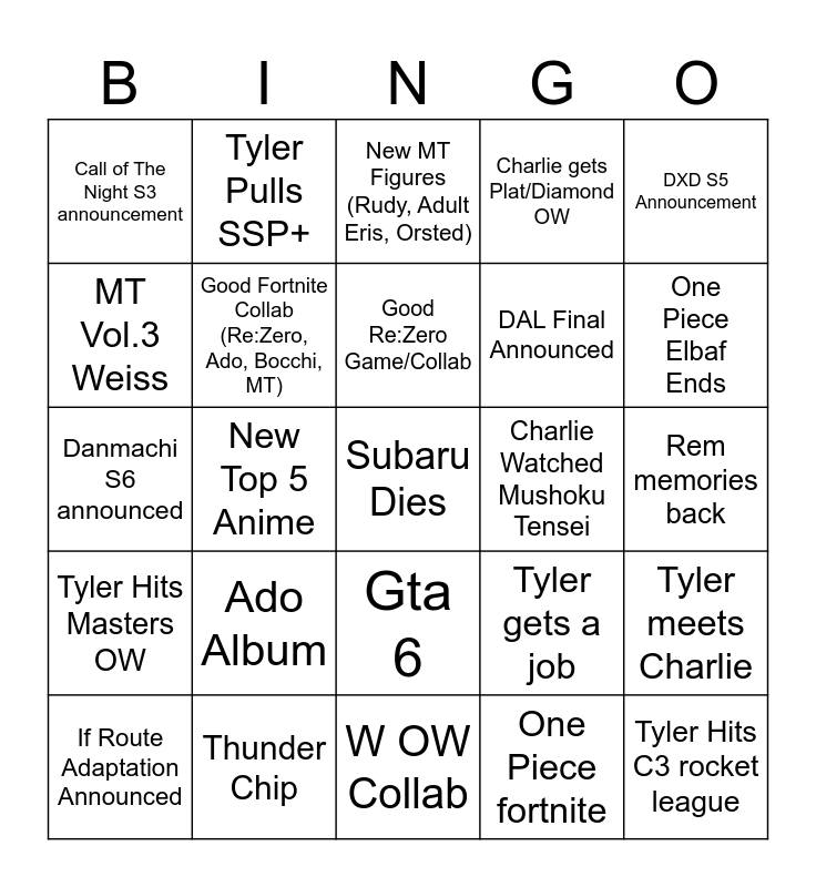 This bingo card has a free space and 24 words: Ado Album, Thunder Chip, Good Re:Zero Game/Collab, If Route Adaptation Announced, DXD S5 Announcement, Call of The Night S3 announcement, MT Vol.3 Weiss, Tyler Pulls SSP+, Charlie Watched Mushoku Tensei, Gta 6, DAL Final Announced, Danmachi S6 announced, Tyler gets a job, Tyler meets Charlie, Good Fortnite Collab (Re:Zero, Ado, Bocchi, MT), One Piece fortnite, Rem memories back, New MT Figures (Rudy, Adult Eris, Orsted), One Piece Elbaf Ends, New Top 5 Anime, Tyler Hits C3 rocket league, Tyler Hits Masters OW, Charlie gets Plat/Diamond OW and W OW Collab.