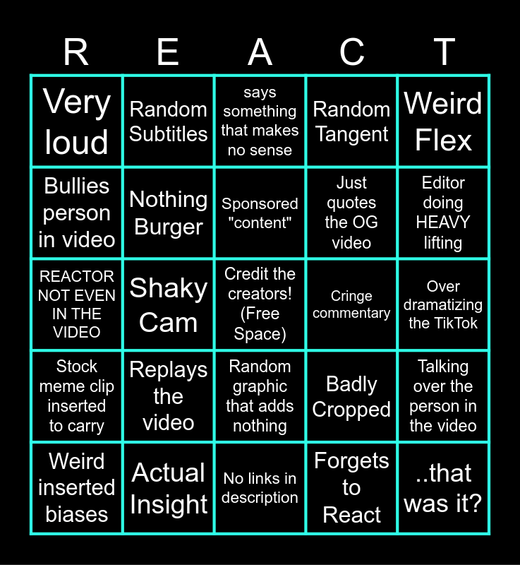 This bingo card has a free space and 32 words: Forgets to React, Freebooting a freebooted video, Shaky Cam, Summarizing the video, Stock meme clip inserted to carry, Nothing Burger, Weird Flex, Talking over the person in the video, Random Subtitles, Only reacts with a laugh, Sponsored "content", says something that makes no sense, Editing Mistake, No credit onscreen, Cringe commentary, TikTok doesn't match the title, Weird inserted biases, REACTOR NOT EVEN IN THE VIDEO, Random graphic that adds nothing, Replays the video, Badly Cropped, Steal's someones jokes, Over dramatizing the TikTok, Actual Insight, ..that was it?, Random Tangent, Just quotes the OG video, Bullies person in video, Very loud, No links in description, "This is me... and Editor doing HEAVY lifting.