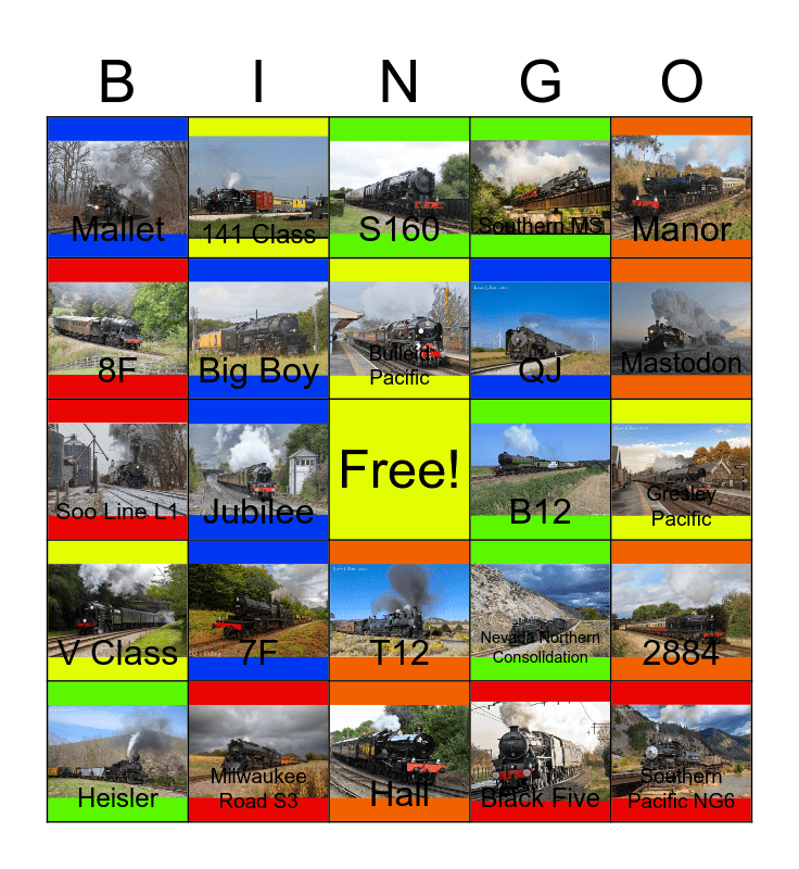 This bingo card has 24 images, a free space and 24 words: 7F, Milwaukee Road S3, Bulleid Pacific, Heisler, Manor, Mallet, 8F, 141 Class, B12, T12, QJ, Soo Line L1, Nevada Northern Consolidation, 2884, Big Boy, Black Five, Gresley Pacific, S160, Mastodon, Jubilee, Southern Pacific NG6, V Class, Southern MS and Hall.