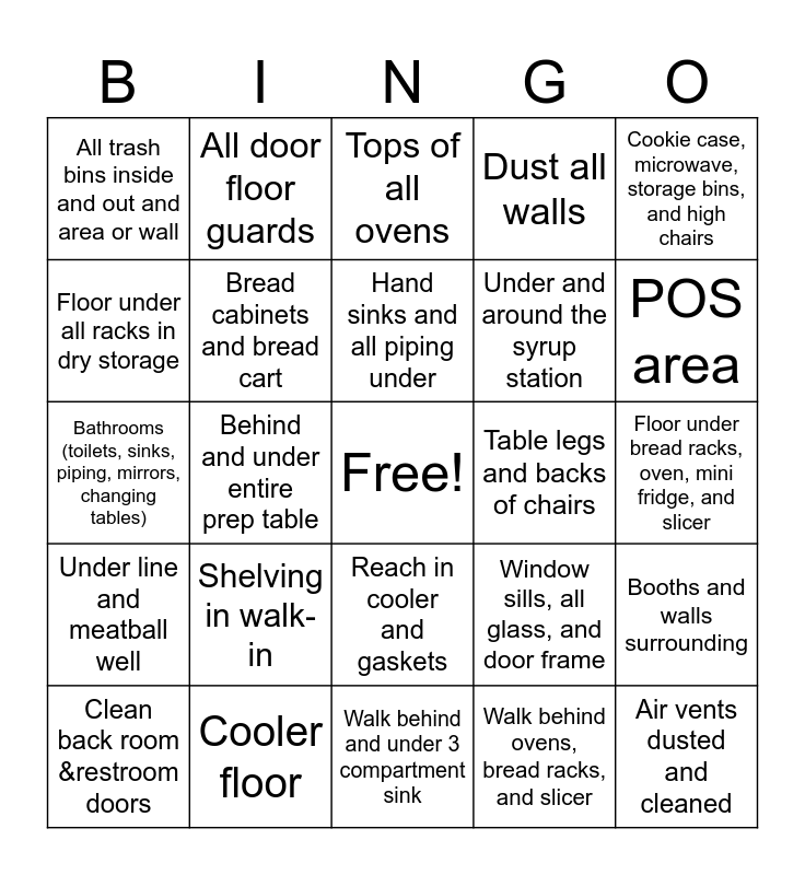 This bingo card has a free space and 29 words: Clean back room &restroom doors, Mop buck, sink, and wet floor signs, Behind and under entire prep table, Bottom of chip rack, front wall of the line, All trash bins inside and out and area or wall, Tops of all ovens, Bread cabinets and bread cart, Shelving in walk-in, Table legs and backs of chairs, Cooler floor, Floor under bread racks, oven, mini fridge, and slicer, Air vents dusted and cleaned, Walk behind and under 3 compartment sink, Walk behind ovens, bread racks, and slicer, POS area, Entire drink station area (walk, drain, cabinets inside and out), Reach in cooler and gaskets, Under line and meatball well, Cookie case, microwave, storage bins, and high chairs, Bathrooms (toilets, sinks, piping, mirrors, changing tables), Window sills, all glass, and door frame, To-go rack, cup rings, condiment holders, and napkin holders, Under and around the syrup station, Floor under all racks in dry storage, Dust all walls, All door floor guards, Booths and walls surrounding, Hand sinks and all piping under and Dust upper walls and all pictures.