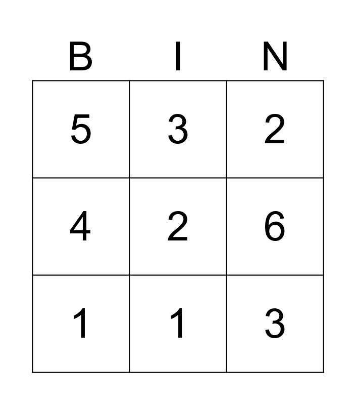 This bingo card has 9 words: 1, 2, 3, 4, 5, 6, 2, 3 and 1.