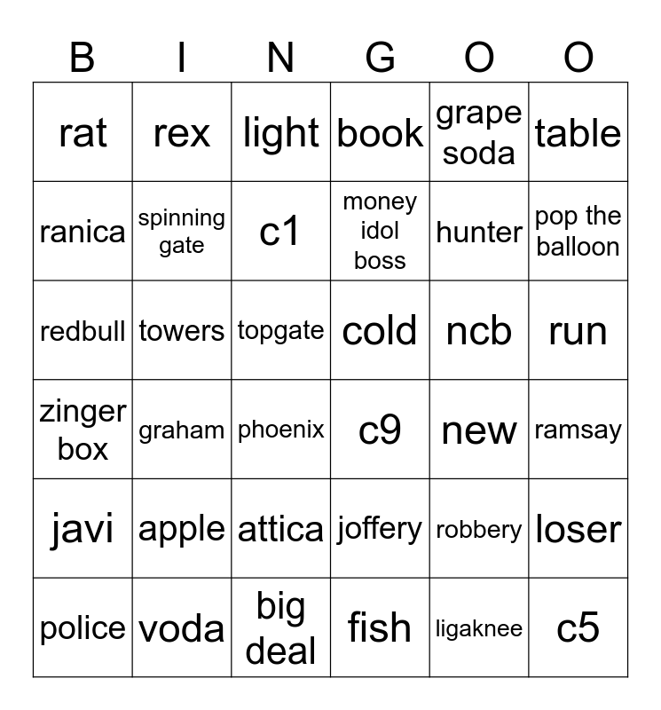 This bingo card has 54 words: school, cold, cloud, apple, run, c5, book, 5k, table, vandilize, rat, fish, c9, phoenix, george, new, redbull, c1, Free!, topgate, zinger box, attica, towers, grape soda, dunce, rex, police, lova, joffery, ramsay, spine, big deal, carnival, rumstripe, light, ligaknee, hunter, graham, javi, ranica, stallion, mary, runci, apollo, ncb, scotia, voda, robbery, spinning gate, pop the balloon, money idol boss, injury, loser and sweat.
