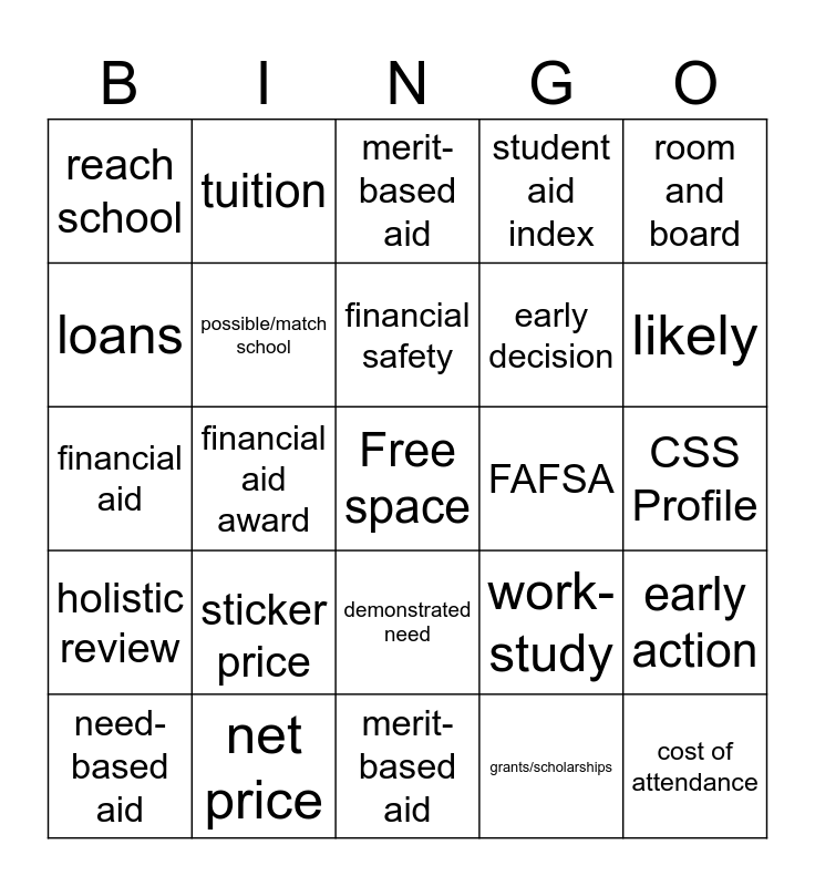 This bingo card has a free space and 24 words: sticker price, net price, financial safety, need-based aid, room and board, reach school, loans, tuition, FAFSA, demonstrated need, early decision, financial aid, work-study, early action, possible/match school, grants/scholarships, CSS Profile, merit-based aid, likely, financial aid award, cost of attendance, holistic review, student aid index and merit-based aid.