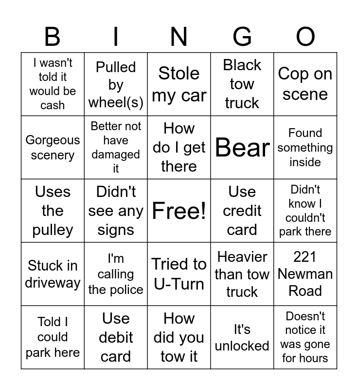 This bingo card has a free space and 29 words: Told I could park here, Only gone 5 minutes, Didn't see any signs, Had owner's permission, I wasn't told it would be cash, Stole my car, Better not have damaged it, I'm calling the police, Use credit card, Use debit card, Didn't know I couldn't park there, Doesn't notice it was gone for hours, How did you tow it, It's unlocked, Found something inside, In a ditch, Tried to U-Turn, Stuck in driveway, Cop on scene, Uses the pulley, Heavier than tow truck, Blocking something, Bear, Gorgeous scenery, Black tow truck, Pulled by wheel(s), 221 Newman Road, How do I get there and Showed up without calling.