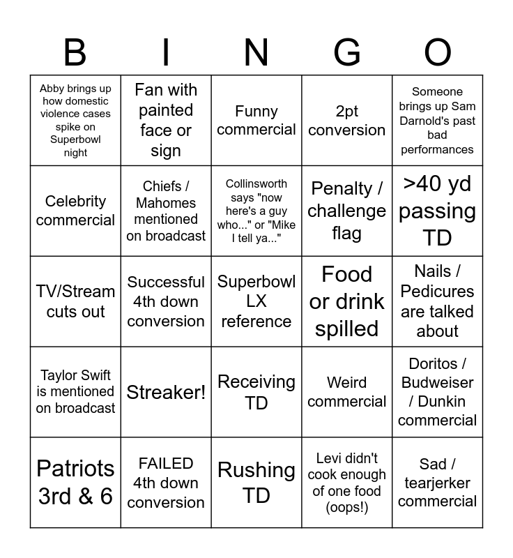 This bingo card has a free space and 29 words: Patriots 3rd & 6, Sack, Successful 4th down conversion, Safety is scored, Abby brings up how domestic violence cases spike on Superbowl night, Funny commercial, Chiefs / Mahomes mentioned on broadcast, Streaker!, Food or drink spilled, FAILED 4th down conversion, Nails / Pedicures are talked about, Sad / tearjerker commercial, Rushing TD, Levi didn't cook enough of one food (oops!), >40 yd passing TD, Levi says he could beat up a/n [insert animal], Receiving TD, Taylor Swift is mentioned on broadcast, Someone brings up Sam Darnold's past bad performances, TV/Stream cuts out, Weird commercial, Fumble!, Penalty / challenge flag, Celebrity commercial, 2pt conversion, Fan with painted face or sign, Doritos / Budweiser / Dunkin commercial, Collinsworth says "now here's a guy who..." or "Mike I tell ya..." and Kicker misses kick.