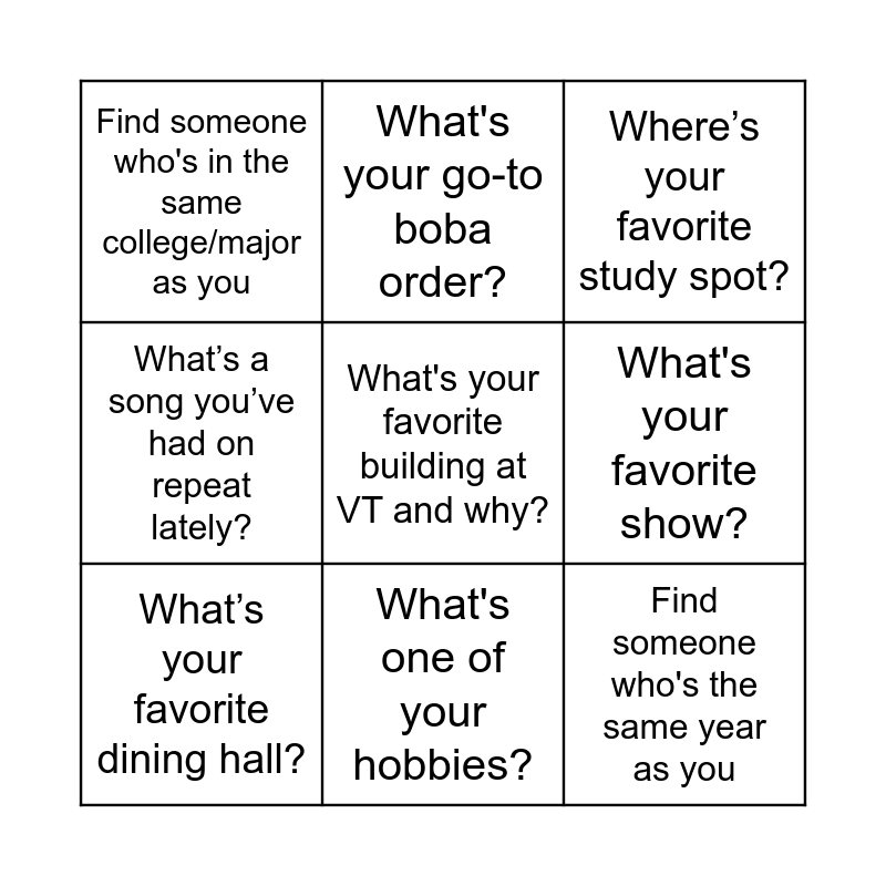 This bingo card has 9 words: What’s your favorite dining hall?, Where’s your favorite study spot?, What's your go-to boba order?, What’s a song you’ve had on repeat lately?, Find someone who's in the same college/major as you, What's your favorite show?, What's your favorite building at VT and why?, Find someone who's the same year as you and What's one of your hobbies?.