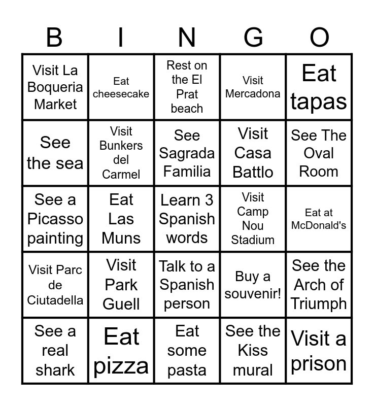 This bingo card has 25 words: Visit Park Guell, Eat some pasta, See Sagrada Familia, See a real shark, Eat tapas, Visit La Boqueria Market, See the sea, Eat cheesecake, Visit Camp Nou Stadium, Talk to a Spanish person, Visit Casa Battlo, See a Picasso painting, Buy a souvenir!, See the Arch of Triumph, Visit Bunkers del Carmel, Visit a prison, Eat at McDonald's, Rest on the El Prat beach, See The Oval Room, Eat Las Muns, Learn 3 Spanish words, Eat pizza, Visit Parc de Ciutadella, Visit Mercadona and See the Kiss mural.