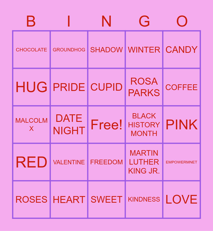 This bingo card has a free space and 24 words: VALENTINE, HEART, CUPID, ROSES, CANDY, CHOCOLATE, HUG, GROUNDHOG, BLACK HISTORY MONTH, FREEDOM, ROSA PARKS, MALCOLM X, MARTIN LUTHER KING JR., EMPOWERMNET, PRIDE, KINDNESS, PINK, SHADOW, COFFEE, DATE NIGHT, LOVE, RED, WINTER and SWEET.