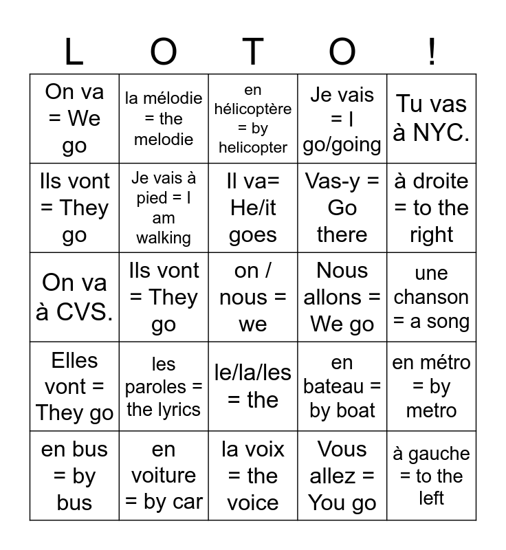 This bingo card has 35 words: aller = to go, en avion = by plane, en train = by train, Je vais à pied = I am walking, le/la/les = the, Je vais = I go/going, Ils vont = They go, Tu vas = You go, Il va= He/it goes, Elle va = She/it goes, On va à CVS., Tu vas à NYC., Il va =he/it goes, en taxi = by taxi, On va = We go, Nous allons = We go, Vous allez = You go, Ils vont = They go, Elles vont = They go, on / nous = we, en bateau = by boat, en bus = by bus, en métro = by metro, en voiture = by car, en hélicoptère = by helicopter, à droite = to the right, à gauche = to the left, Allez = Go, Vas-y = Go there, une chanson = a song, le clip = the music video, la voix = the voice, les paroles = the lyrics, la mélodie = the melodie and qui = who.