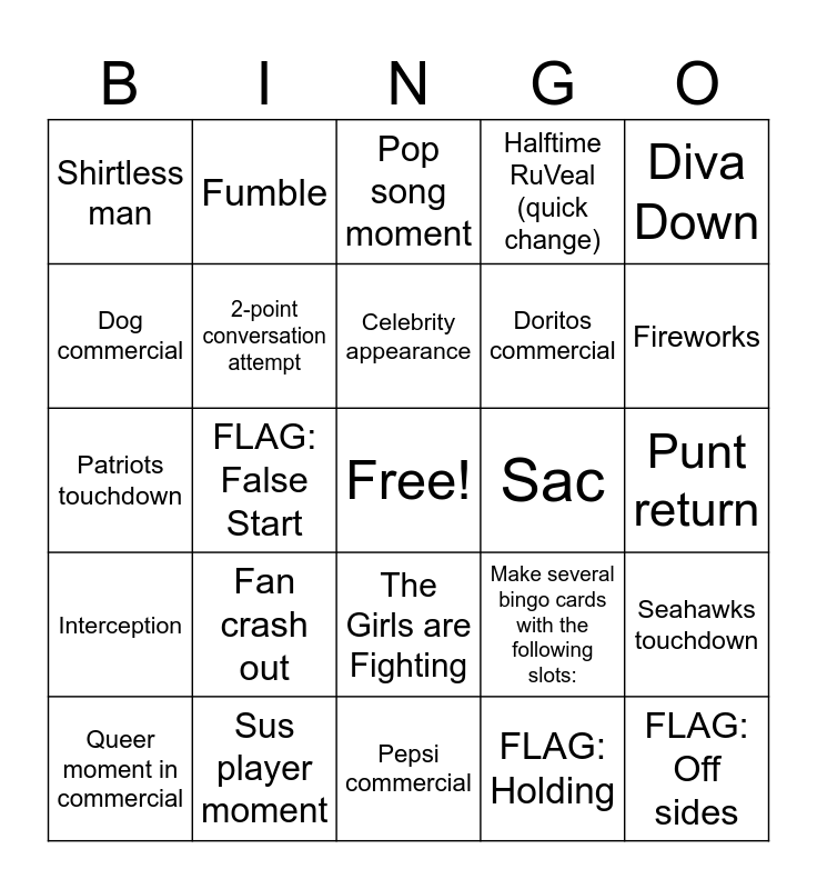 This bingo card has a free space and 27 words: Make several bingo cards with the following slots:, Coach crash out, Doritos commercial, Pepsi commercial, Dog commercial, Pop song moment, Fumble, Interception, Sac, Seahawks touchdown, Patriots touchdown, Halftime RuVeal (quick change), Queer moment in commercial, Sus player moment, Fireworks, Missed field goal, 2-point conversation attempt, Celebrity appearance, Fan crash out, Shirtless man, Punt return, FLAG: Holding, FLAG: False Start, FLAG: Off sides, The Girls are Fighting, Diva Down and Incomplete Pass.