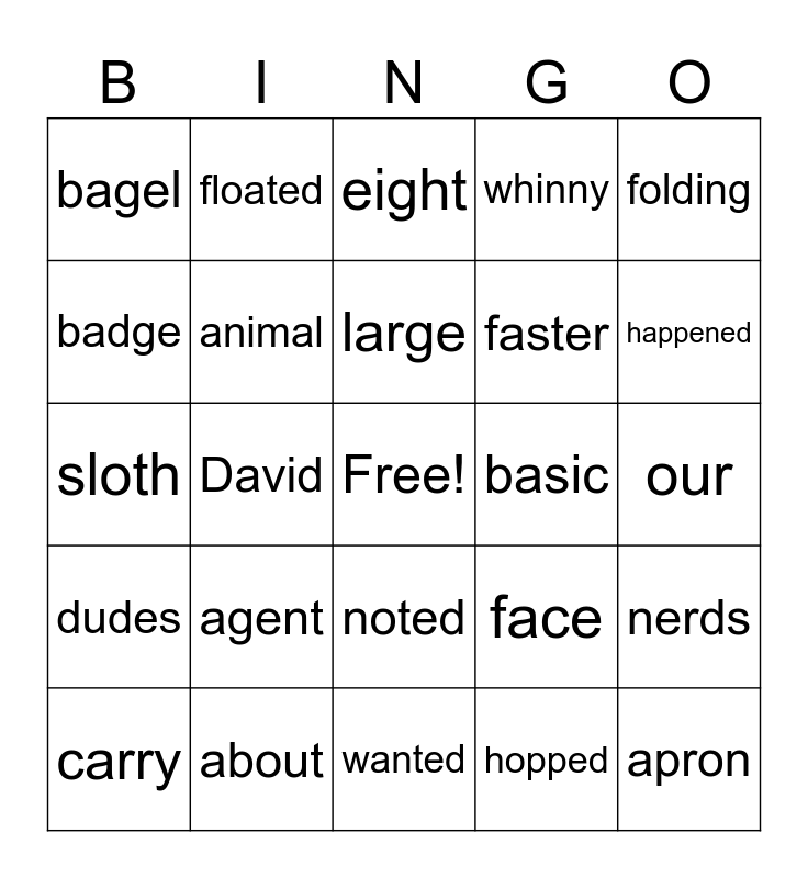 This bingo card has a free space and 29 words: carry, April, David, give, bagel, eight, animal, agent, basic, about, our, apron, wanted, hopped, happened, queen, noted, dudes, folding, sloth, face, shine, faster, badge, whinny, floated, nerds, large and tone.