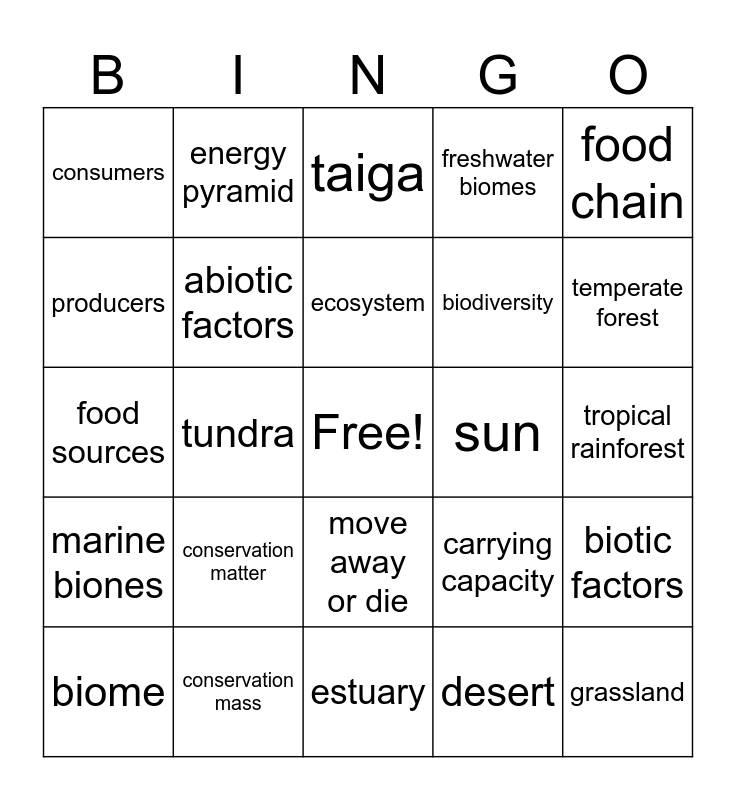 This bingo card has a free space and 24 words: conservation matter, conservation mass, ecosystem, biome, food chain, consumers, producers, energy pyramid, sun, move away or die, biodiversity, food sources, carrying capacity, biotic factors, abiotic factors, desert, tropical rainforest, taiga, temperate forest, tundra, grassland, marine biones, freshwater biomes and estuary.