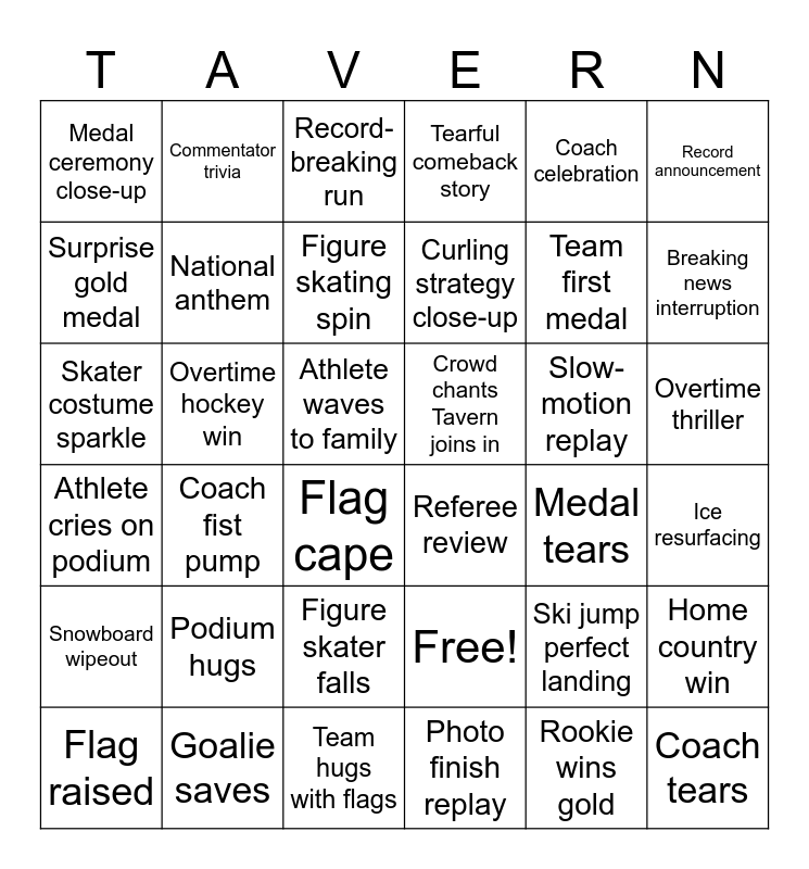 This bingo card has 36 words: Free!, Figure skater falls, Photo finish replay, Surprise gold medal, Athlete cries on podium, Crowd chants Tavern joins in, National anthem, Team hugs with flags, Coach celebration, Ski jump perfect landing, Breaking news interruption, Tearful comeback story, Home country win, Overtime hockey win, Curling strategy close-up, Medal ceremony close-up, Snowboard wipeout, Slow-motion replay, Skater costume sparkle, Record-breaking run, Athlete waves to family, Coach fist pump, Referee review, Flag cape, Medal tears, Commentator trivia, Team first medal, Goalie saves, Figure skating spin, Record announcement, Coach tears, Flag raised, Ice resurfacing, Overtime thriller, Podium hugs and Rookie wins gold.