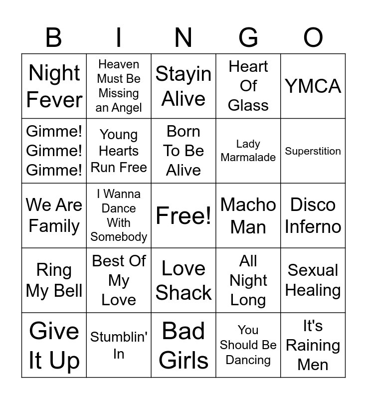 This bingo card has a free space and 78 words: Hot Stuff, Super Freak, Stayin Alive, I'm Coming Out, I'm Every Woman, Dancing Queen, Le Freak, I Will Survive, That's The Way (I like it), Let's Dance, Don't Stop Til You Get Enough, I'm So Excited, Heart Of Glass, Night Fever, Good Times, Gimme! Gimme! Gimme!, Upside Down, Best Of My Love, Blame it on The Boogie, Disco Inferno, Brick House, YMCA, We Are Family, Born To Be Alive, Young Hearts Run Free, He's The Greatest Dancer, Rock With You, Get Down on it, Maniac, Play That Funky Music, Superstition, Get up Offa That Thing, Bad Girls, Caribbean Queen, Give It Up, Macho Man, You Sexy Thing, Boogie Wonderland, September, It's Raining Men, funkytown, You're The First, The Last, My Everything, Rock The Boat, Love Train, The Rubberband Man, Heaven Must Be Missing an Angel, Got To Be Real, Forget Me Nots, Celebration, Let's Groove, Sexual Healing, I Wanna Dance With Somebody, All Night Long, Rivers of Babylon, Rasberry Beret, Somebody's watching Me, Car Wash, Rich Girl, Lovely Day, Love Shack, Lady Marmalade, Shining Star, Come And Get Your Love, She's A Lady, Can't Get Enough of Your Love, Thunder Island, Everlasting Love, Love Rollercoaster, Ring My Bell, Stumblin' In, Because the Night, Say You Loved Me, Vehicle, Southern Nights, You Should Be Dancing, War, Shake Shake Shake and You Make Loving Fun.