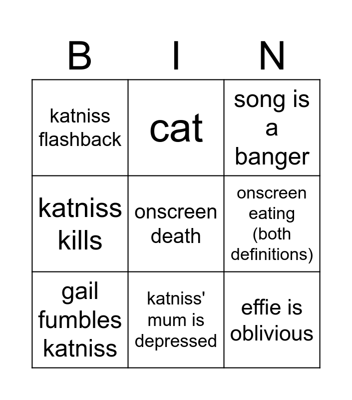 This bingo card has a free space and 17 words: president snow is evil, nightlock, song is a banger, katniss flashback, peeta fumbles katniss, katniss kills, hamish is an alcoholic, gail fumbles katniss, katniss' mum is depressed, onscreen eating (both definitions), gay subtext, katniss crashes out (like alfie), effie is oblivious, cat, president snow, 'may the odds be ever in your favour' and we live in a society.