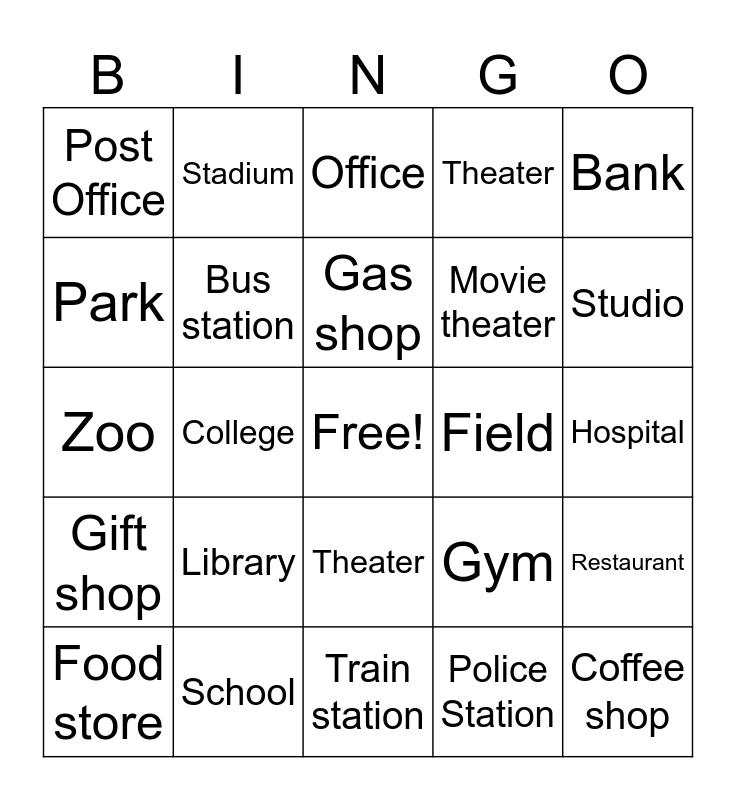 This bingo card has a free space and 24 words: Library, School, Gas shop, Food store, Bank, Post Office, Park, Stadium, Field, Theater, Movie theater, Zoo, Gym, Restaurant, Bus station, Police Station, Hospital, Office, Studio, College, Coffee shop, Gift shop, Theater and Train station.