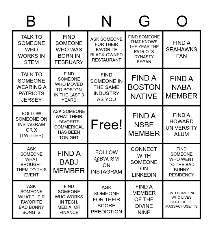 This bingo card has a free space and 24 words: FIND A BABJ MEMBER, FIND SOMEONE WHO WORKS IN TECH, MEDIA, OR FINANCE, FIND SOMEONE IN THE SAME INDUSTRY AS YOU, ASK SOMEONE WHAT THEIR FAVORITE BAD BUNNY SONG IS, FIND A SEAHAWKS FAN, TALK TO SOMEONE WHO WORKS IN STEM, TALK TO SOMEONE WEARING A PATRIOTS JERSEY, FIND SOMEONE WHO WAS BORN IN FEBRUARY, FIND A NSBE MEMBER, FOLLOW @BW.ISM ON INSTAGRAM, FIND A BOSTON NATIVE, FOLLOW SOMEONE ON INSTAGRAM OR X (TWITTER), CONNECT WITH SOMEONE ON LINKEDIN, FIND SOMEONE WHO WENT TO THE BAD BUNNY RESIDENCY, FIND SOMEONE WHO MOVED TO BOSTON IN THE LAST 3 YEARS, FIND A MEMBER OF THE DIVINE NINE, FIND A HOWARD UNIVERSITY ALUM, ASK SOMEONE FOR THEIR FAVORITE BLACK-OWNED RESTAURANT, FIND A NABA MEMBER, ASK SOMEONE WHAT THEIR FAVORITE COMMERICAL HAS BEEN TONIGHT, FIND SOMEONE WHO LIVES OUTSIDE OF MASSACHUSETTS, ASK SOMEONE WHAT BROUGHT THEM TO THIS EVENT, FIND SOMEONE THAT KNOWS THE YEAR THE PATRIOTS DYNASTY BEGAN and ASK SOMEONE FOR THEIR SCORE PREDICTION.